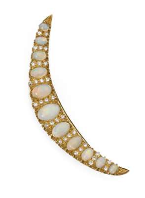 set with eleven graduated oval cut opal cabochons interspersed by borders of single cut diamonds