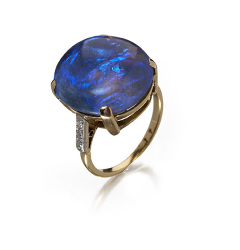 The name given to the gem species opal is derived from an Indian (Sanskrit) word for stone. It is divided into three sub-groups: common opal (showing no play of colour); yellow-red coloured fire opals and precious opal. Precious opal displays a range of iridescent colours, which change as the stone is tilted, against a pale or dark background. Black opal, includes precious opal with dark grey, dark blue (as in this lot), dark green and grey-black basic body colours and is rarer than white opal.