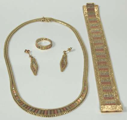 comprising a necklace, 9ct gold bracelet, pendant earrings and ring, each with textured finish (4)