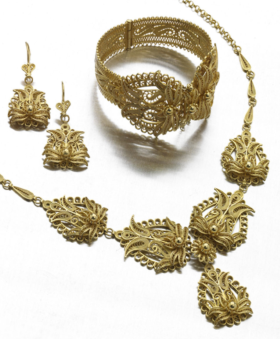 comprising a necklace, pendant earrings and hinged bangle, each composed of filigree worked foliate scrolls, stamped 22 (3)