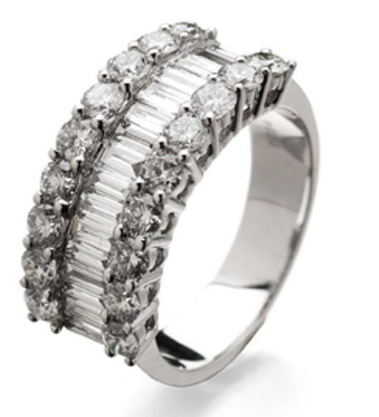 with invisibly set border of baguette cut diamonds, flanked above and below by claw set borders of round brilliant cut diamonds, to a tapering shank, stamped 18K 750