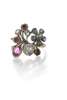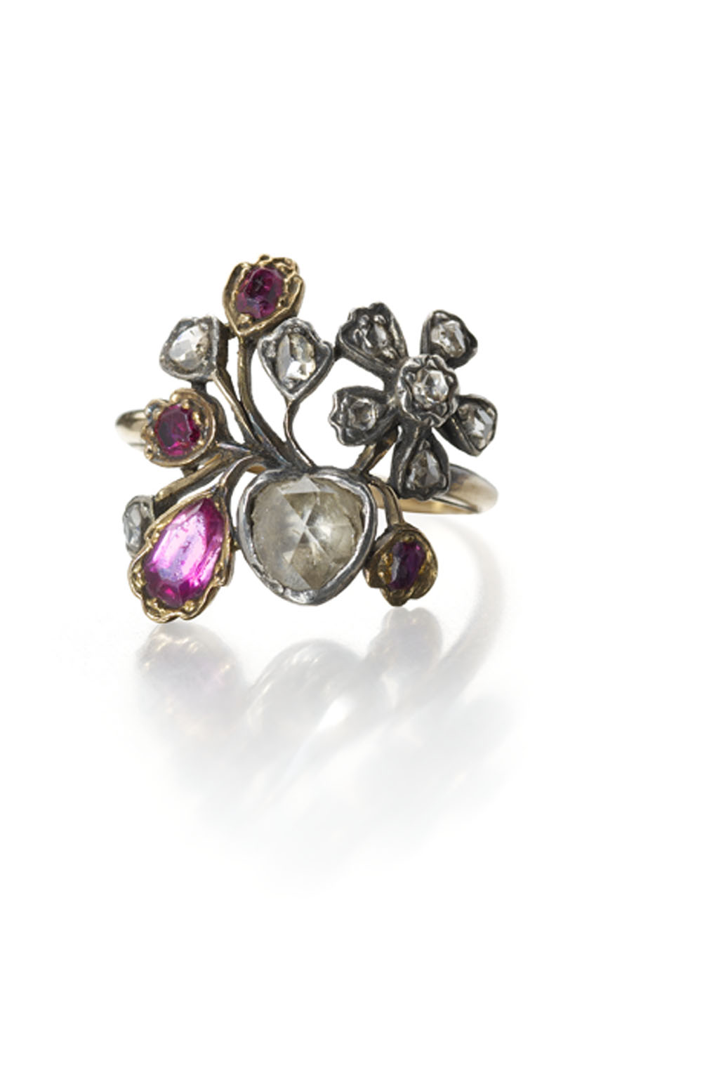 the curved two-colour front collet set with a large rose cut diamond amidst a surround of smaller similarly cut diamonds and graduated oval cut rubies, the plain shank unmarked (tests as gold)
