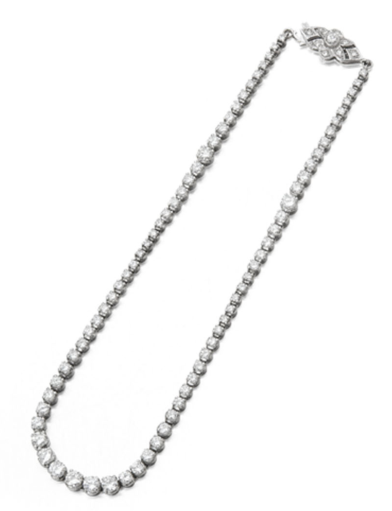 composed of claw set graduated round brilliant cut diamonds, with shaped oval clasp, also set with round brilliant and single cut diamonds