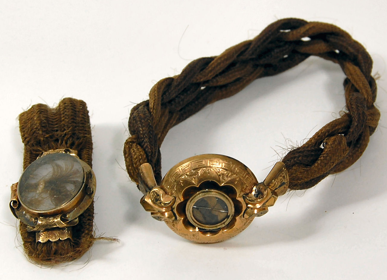 to include a woven hair bracelet, with oval locket form clasp; another composed of plaited woven hair, with central circular locket; an eight-row simulated pearl necklace, the pointed oval clasp with central glazed panel, containing scrolls of hair, with seed pearl set border; also a three-row simulated pearl necklace, with shaped circular clasp set with colourless and dark red gems (4)