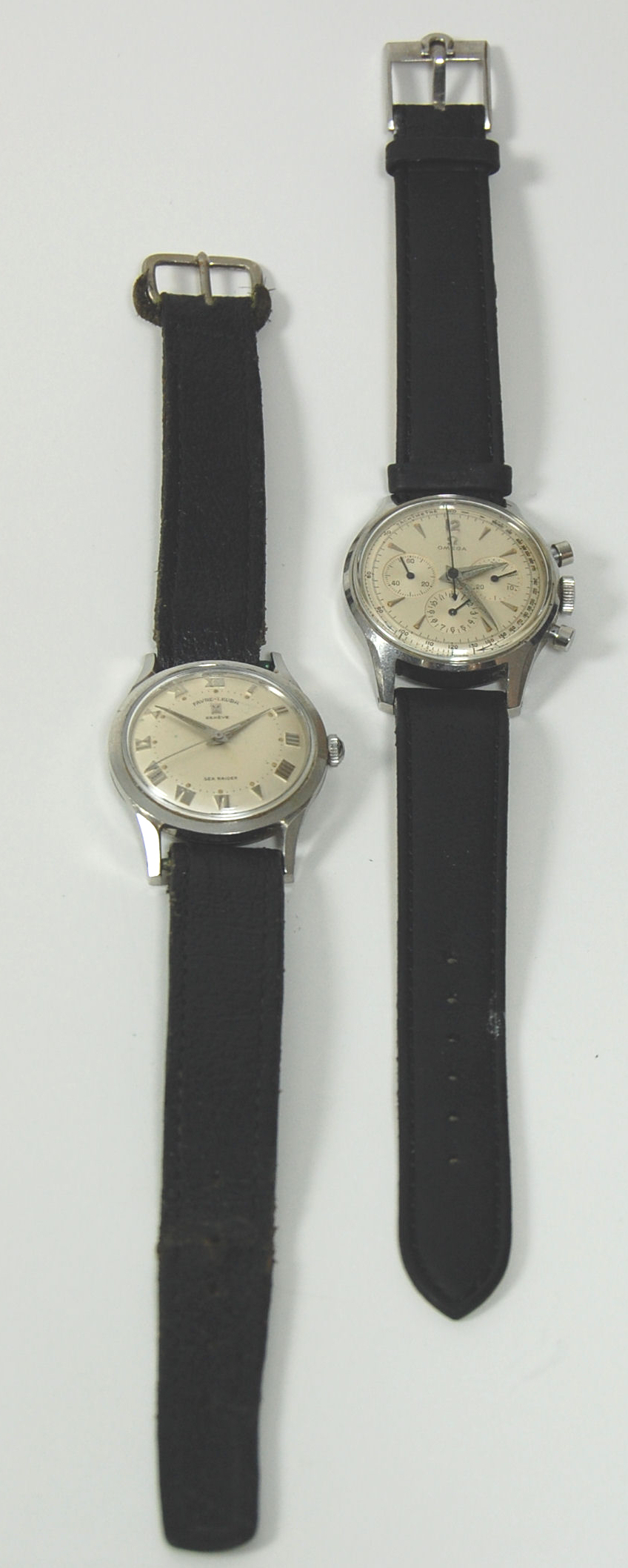 the off-white dial with baton and Arabic numerals and three subsidiary dials, the winder flanked by two push-buttons, fitted to a black leather strap; also a FAVRE-LEUBA gentleman's stainless steel wrist watch, with champagne coloured circular dial, Roman numerals, stamped FAVRE-LEUBA GENEVE, SEA RAIDER, numbered to reverse 41073 639, fitted to a black leather strap (2)
