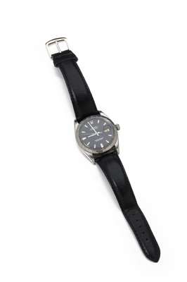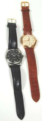 the champagne coloured dial with gold baton numerals and hands, stamped ROLEX PERPETUAL, OFFICIALLY CERTIFIED CHRONOMETER, numbered to reverse 2241, also stamped with French control marks, fitted to a tan leather strap; also a ROLEX 1970's gentleman's stainless steel wrist watch, the black circular dial with silver coloured baton numerals and hands and date aperture, stamped ROLEX OYSTER PERPETUAL DATEJUST, SUPERLATIVE CHRONOMETER OFFICIALLY CERTIFIED, fitted to a black leather strap