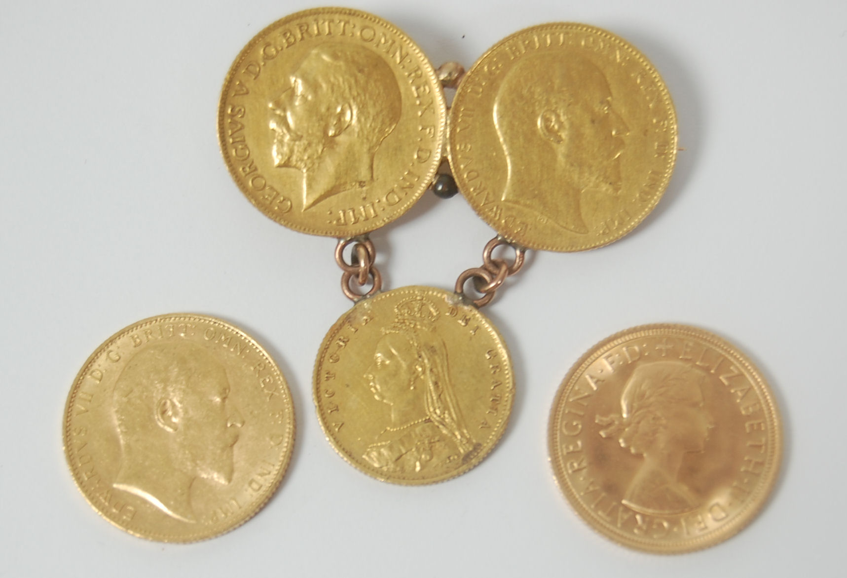 Edward VII 1909, M; Elizabeth II 1968; together with brooch formed from two gold sovereigns (1910 and 1911) and with a half sovereign drop (1887 shield back) (3)