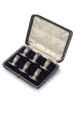 by S Mordan and Company, Chester 1918, the standing owl naturalistically formed with yellow and black glass eyes, resting on simple circular bases, in original fitted case for Hamilton and Inches Edinburgh