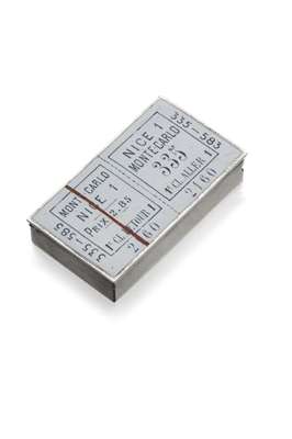 apparently unmarked, of simple rectangular outline with plain base, the sprung hinged lid with enamel of a Monte Carol - Nice two section travel ticket, with striker to right hand edge of body