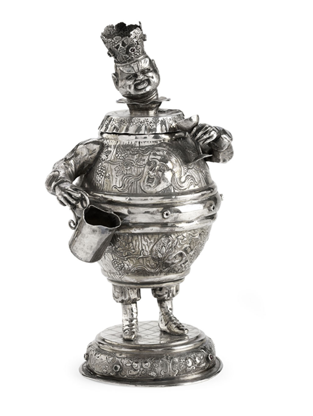 with marks for Ausburg, in the form of a drunk king or jester, the barrel form body with moulded girdle set with collet set green and red cabochons, the upper and lower sections embossed with bacchanalian figures and fruiting vines, the figures arms holding a jug in one hand and a chalice in the other, the pull off cover with loosely fitted crowned head (also set with green and red cabochons), the domed circular base similar decorated