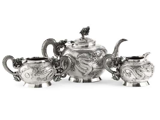 comprising tea pot, milk jug and twin handled sugar bowl, the bodies with planished finish and embossed with dragons, the handles formed as dragons with arched backs (3)
