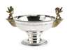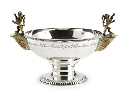 by Garrards & Co, London 1990 the large shallow circular bowl with bracket handles with gilt detailed thistle and rose head detail, the handles with lion rampant finials, the bowl inscribed 'A Birthday Tribute to Her Majesty Queen Elizabeth The Queen Mother, 4th August 1990', raised on a squat trumpet foot with simple gadrooned border, contained in original fitted box