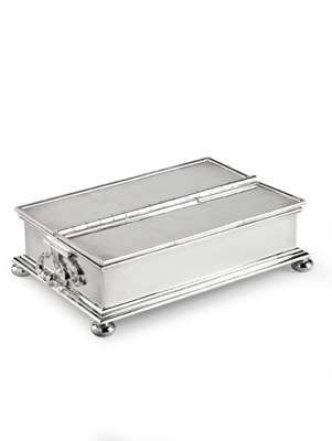 by Atkins Brothers of Sheffield 1927, retailed by Davidson Henderson & Sorley Glasgow, of simple rectangular outline with raised borders, the hinged cover with three small compartments two fitted for inkwells and with pen box to opposing side, with two swing loop handles, raised on four ball feet