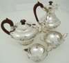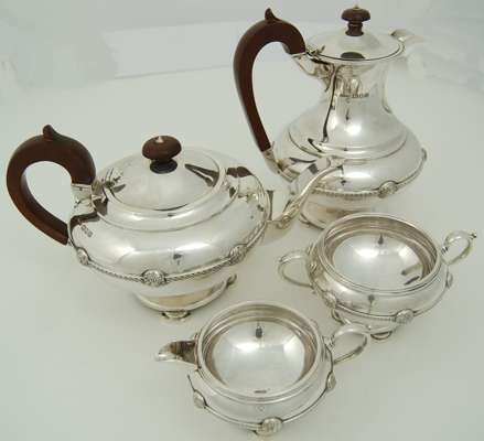 By Asprey & Co London 1927, comprising coffee pot, teapot, twin handled sugar bowl, cream jug of simple plain form with baluster bodies with central applied Celtic bosses and swirl border, with simple C scroll handles and raised on stepped semi circular feet (4)