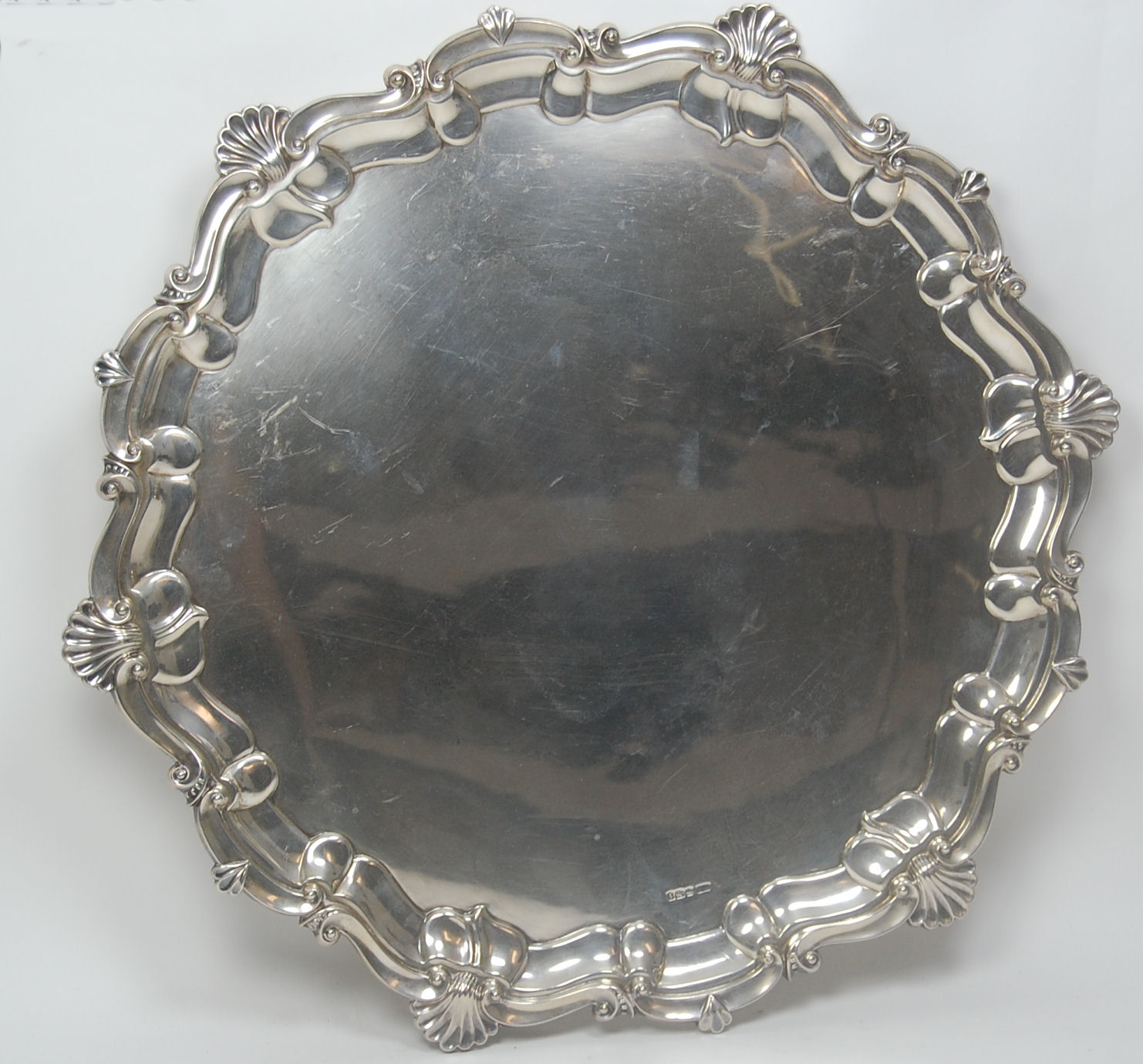by Atkins Brother, Sheffield 1926, of shaped circular outline with C scroll and shell border, raised on three scroll bracket feet