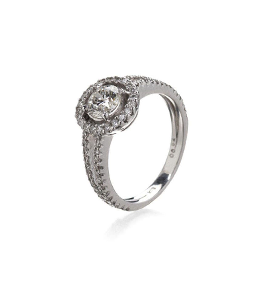 the central claw set round brilliant cut diamond within a border of smaller similarly cut diamonds, with two-row diamond set shank, stamped K18