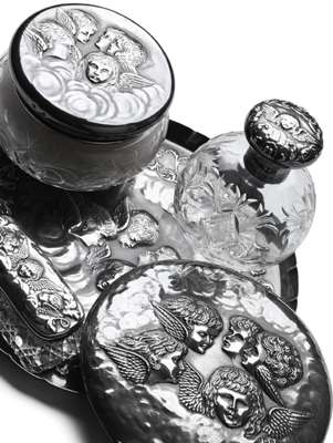 by various makers and date, comprising large quatrefoil tray, pair of smaller trays, pair of clothes and hair brushes, comb, hand mirror and two covered pots, large powder jar and cover, all with embossed design of winged cherubs in the clouds (14)