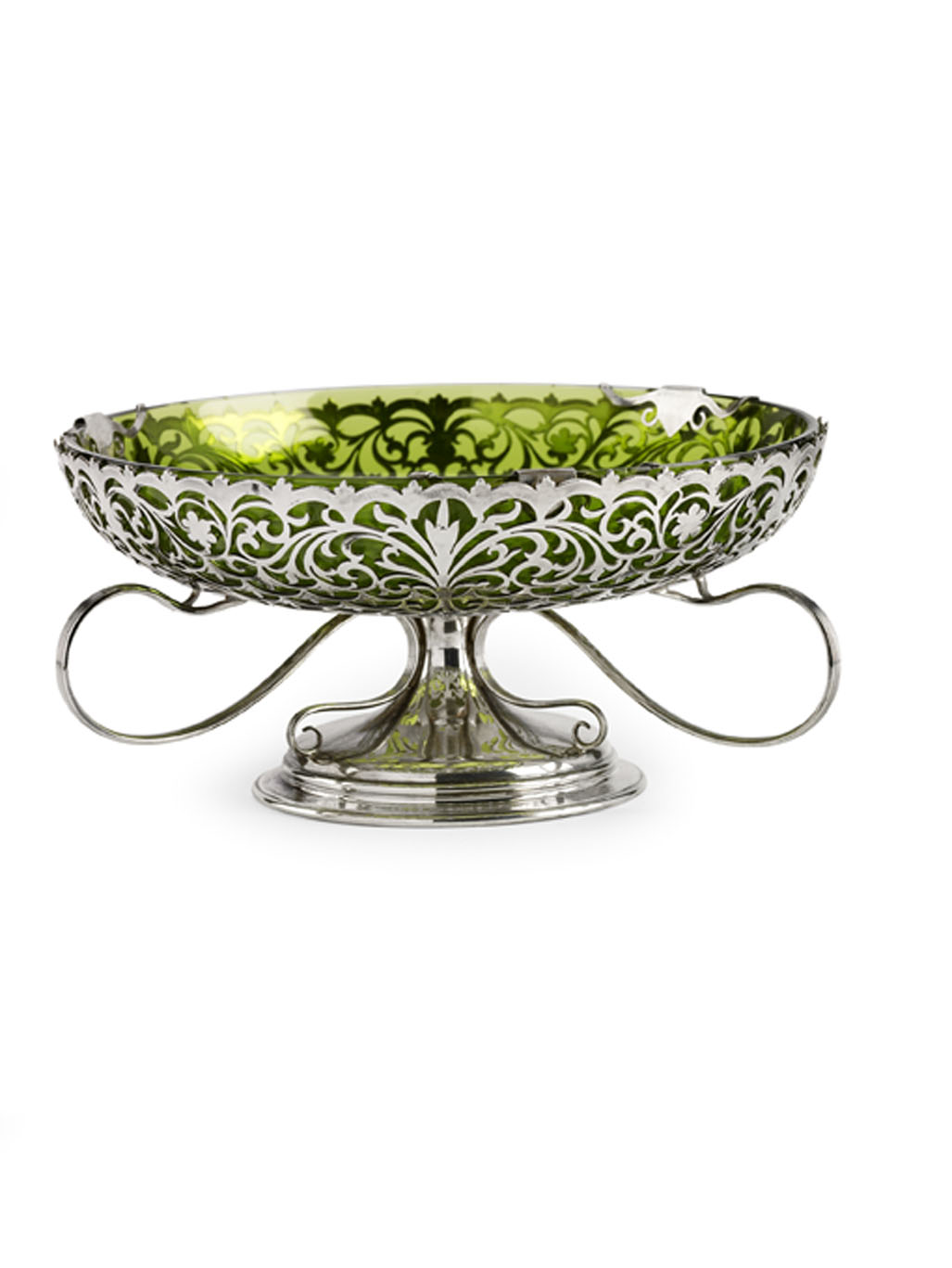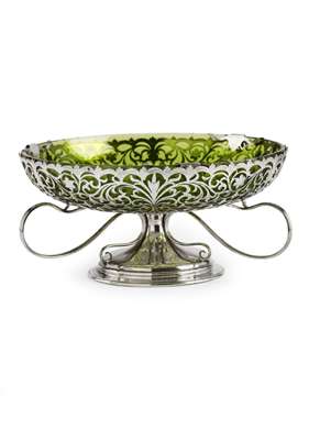 by Sorley of Glasgow, Sheffield 1907, additionally inscribed SORLEY, silversmiths to H.M. King, Glasgow, of circular outline, the shallow bowl pierced with stylised scrolling flower and foliate design, resting on three strap work scroll handles on stepped domed foot rim, with a green glass liner