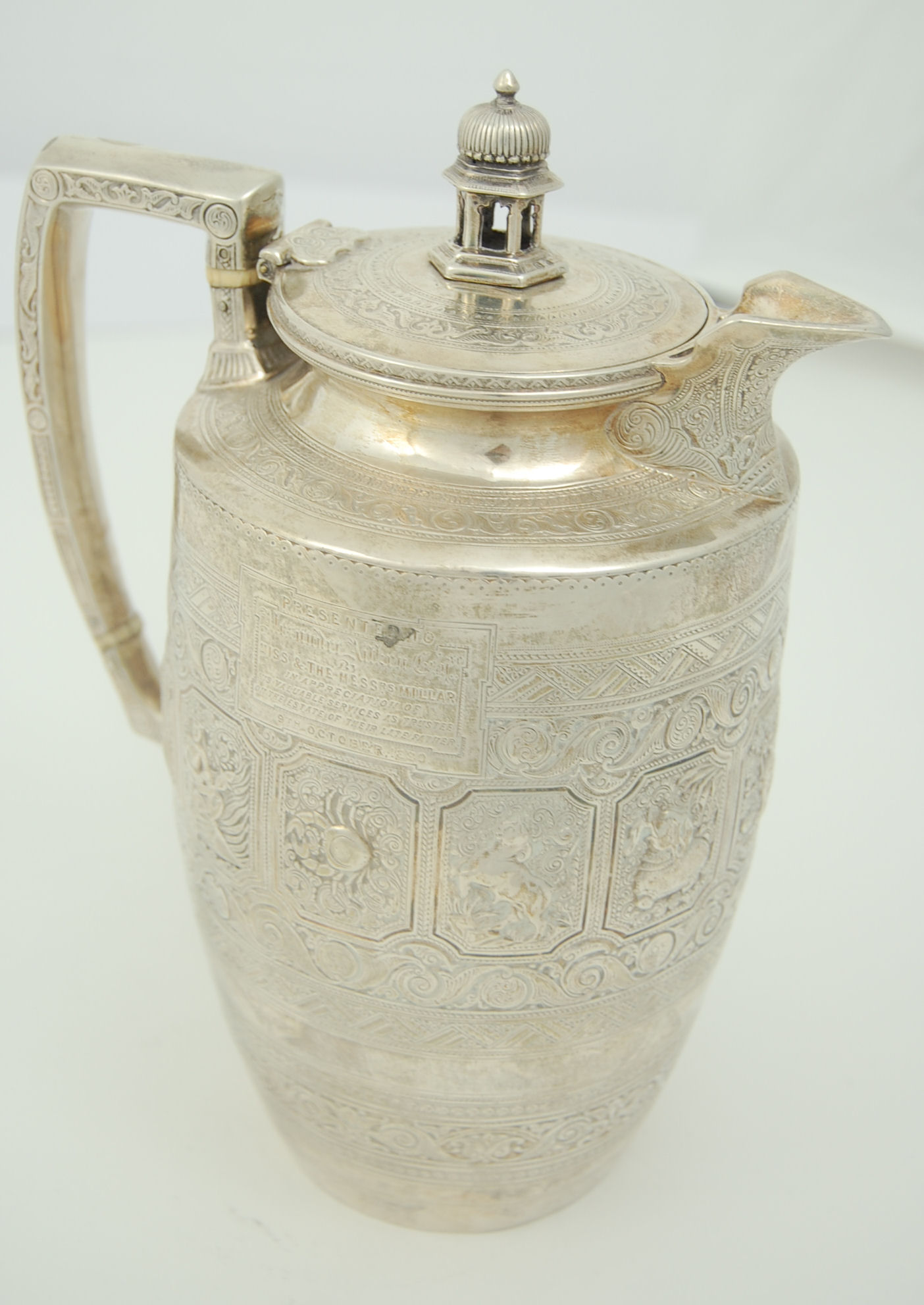 by Hamilton & Inches, Edinburgh 1873 of tapered cylindrical form, the body decorated with scroll and zig zag borders with twelve panels of oriental and zodiac symbols, the flat hinged cover with pagoda finial, the angular handle with engraved borders and ivory insulators