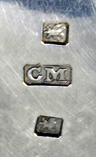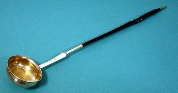by Charles Murray of Perth circa 1800, marked double headed eagle, CM, double headed eagle, with elliptical bowl and flared rim and simple flared rectangular stem with reeded detail, engraved to reverse JG in contemporary script, with part twisted baleen handle, with simple pointed finial