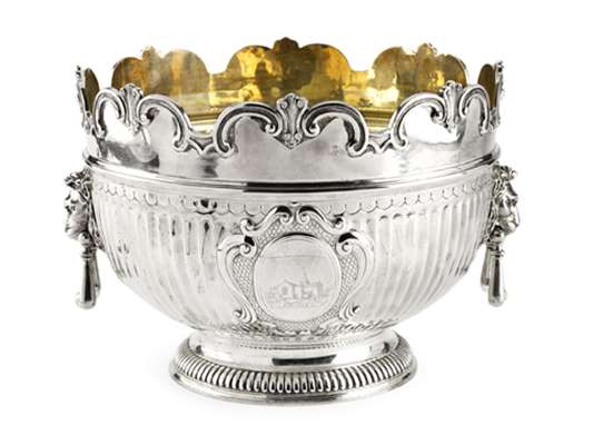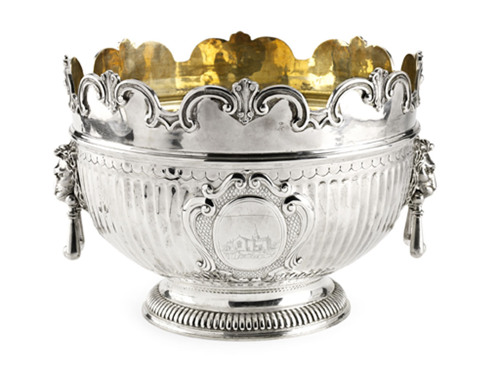 by W, J, M, S Barnard & R Dubock London 1896, of traditional form with scalloped and moulded rim, with lion mask and angular ring handles, concave fluted lower section the cartouches engraved with scene of a Church, resting on a gadrooned circular foot rim, the base engraved with retailer's mark for 'James Aitchison Edinburgh'
