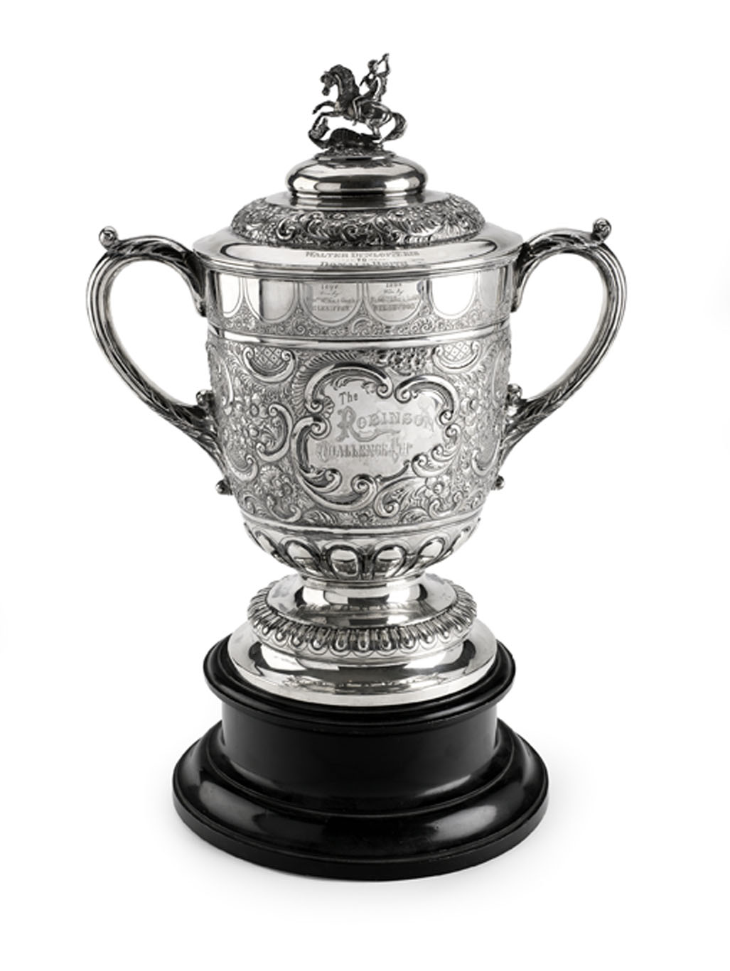 The cartouches to the body are engraved 'The Robinson Challenge cup' and 'Presented by Sir William Robinson K.C.M.G Hong Kong February 1897'. The lid is engraved to rim 'From Walter Dunlop McKie to Donald Beith'. The winners' cartouches are engraved '1897 won by Messrs McKie & Goves GLENIFFER' and '1898 won by Messrs McKie & Goves BEECHWOOD'.