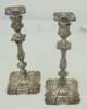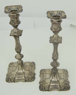 by Walker Knowles and Company Sheffield 1859 the tapered fluted and knopped stem above and quatro foil base with scroll details to corners, the sconces similarly decorated (2)