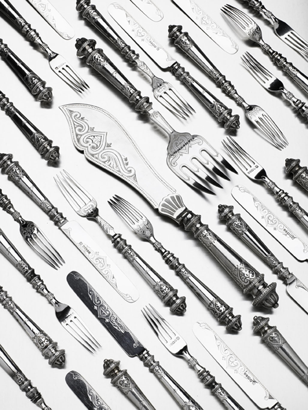 by R Martin & E Hall, various dates, comprising twenty four dessert knives and forks, cake serving knife and fork, each with tapered cylindrical handles, with fluted terminals the grips with heart shaped borders with foliate detail, the knife blades with engraved scroll and hatched borders, the forks with chased foliate scroll detail (qty)