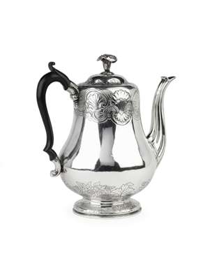 by Robert Garrard London 1825, the body of baluster form with chased border of scroll and shell to rim, and floral and foliate scroll to base, the hinged slightly domed cover with flower finial, swan necked fluted spot, resting on a simple foot rim chased with foliate and shell borders