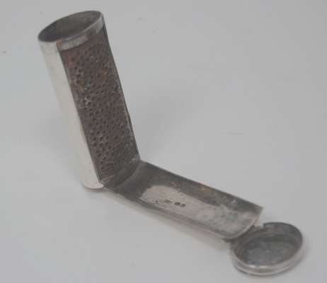 C.R, London 1828, of oval outline with simple drop front and hinged cover with reeded border, original pierced steel grill to interior