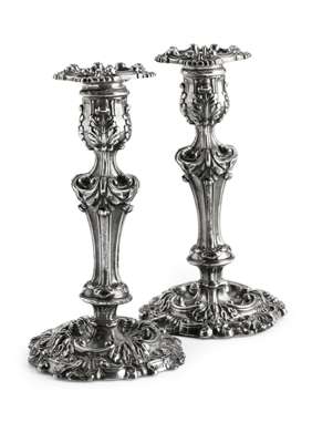 by J Watson & Son Sheffield 1826, the fluted and tapered stems with scroll knopped details and sconce, the shaped circular base with C scroll and foliate design (2)