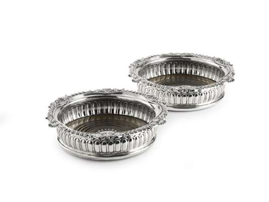 By R & S Hennell London 1811 of circular outline, the slightly baluster bodies with convex fluted borders above reeded rim, the everted shaped circular rim with gadrooning and shell and acanthus details, the turned wooden bases with simple domed plaque to centre (2)