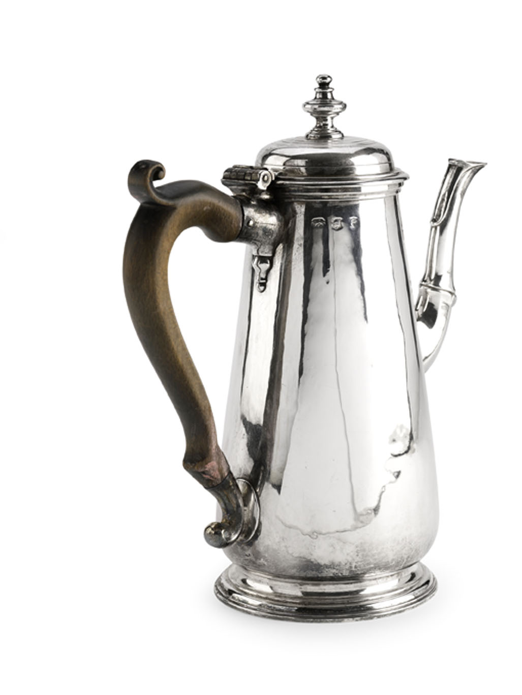 by Edward Feline London 1740 the body of plain tapered cylindrical form on stepped foot rim, with domed hinged cover with urn final, S scroll wooden handle and facetted swan neck spout