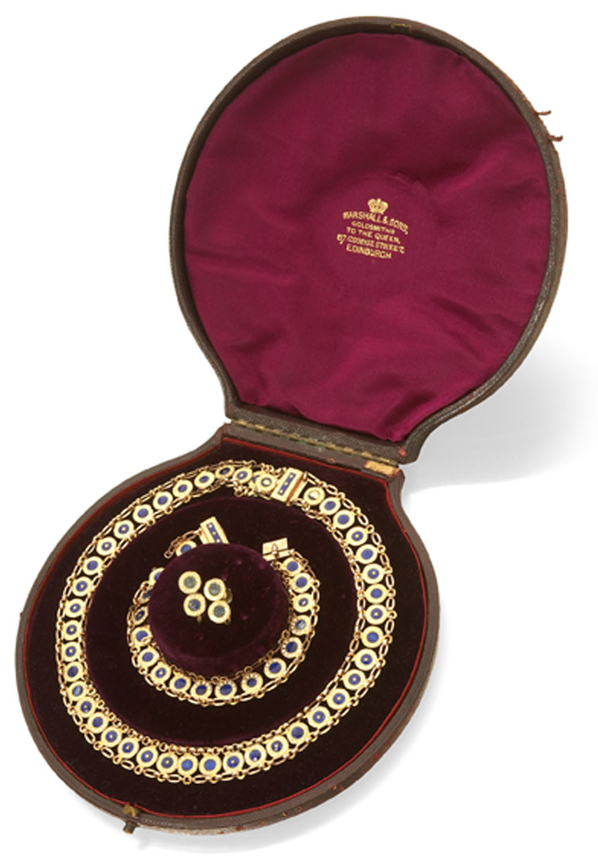 comprising a necklace, bracelet and earrings, each composed of circular motifs decorated with a gilt star to a blue enamelled ground within white enamelled dot borders, conjoined by fancy belcher links, with similarly decorated rectangular clasps (A/F)