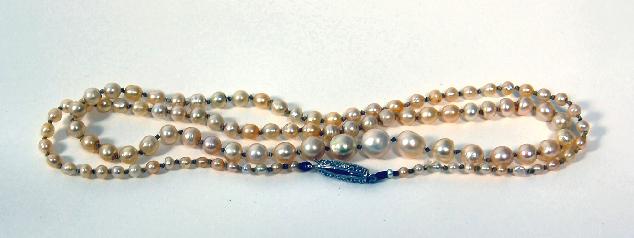 A graduated pearl necklace with diamond set clasp,
