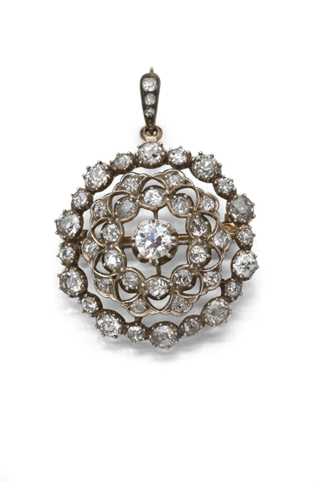 of shaped circular design, composed of graduated circular borders, set throughout with old European cut diamonds, with detachable diamond set bale and brooch fittings