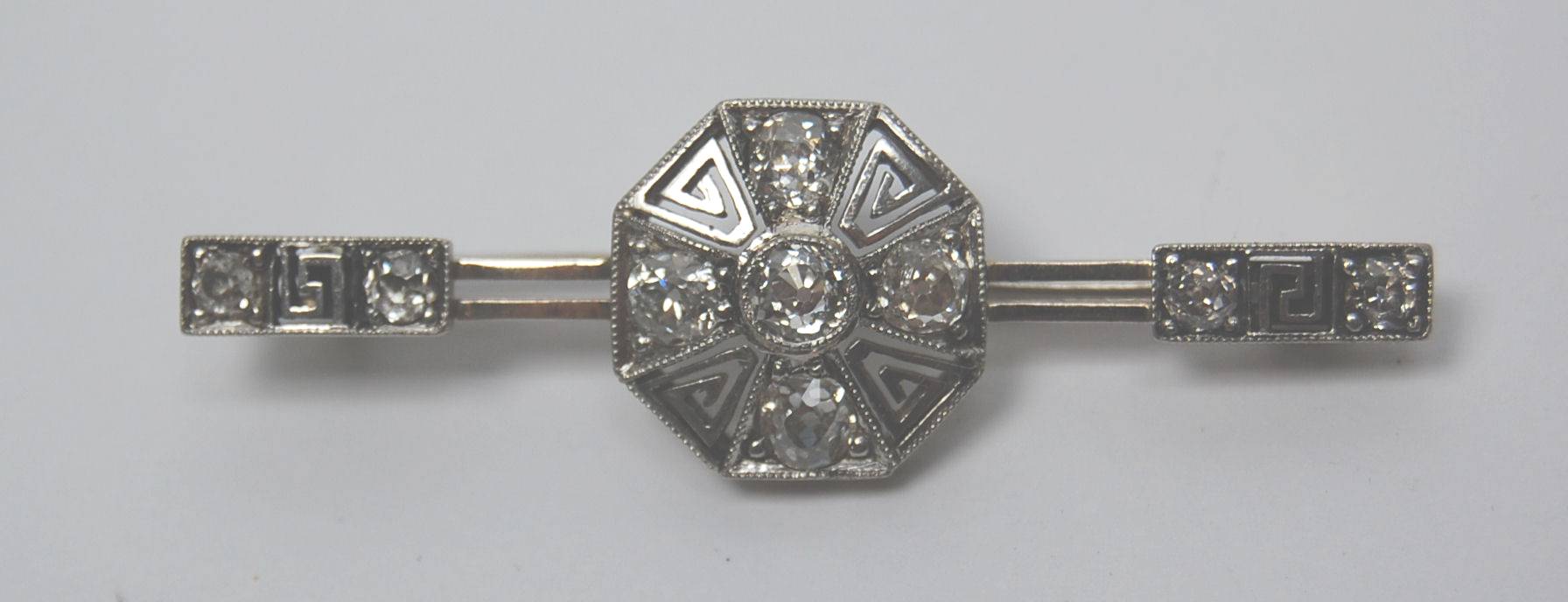 the central octagonal plaque millegrain collet set to the centre with an old European cut diamond, within a border of four similarly cut diamonds interspersed by pierced panels, to a double knife bar, set to each terminal with two smaller similarly cut diamonds flanking a square pierced plaque