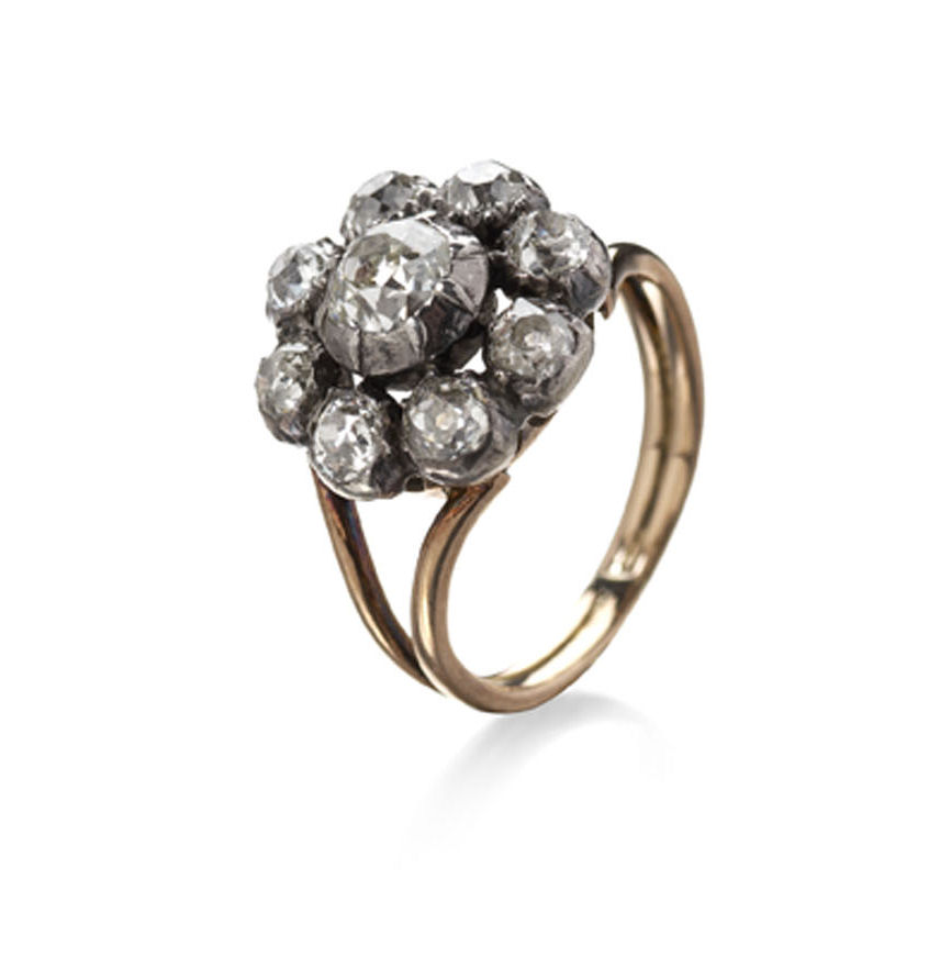 composed of nine graduated old mine cut diamonds, with heavy collet settings, flanked by split shoulders