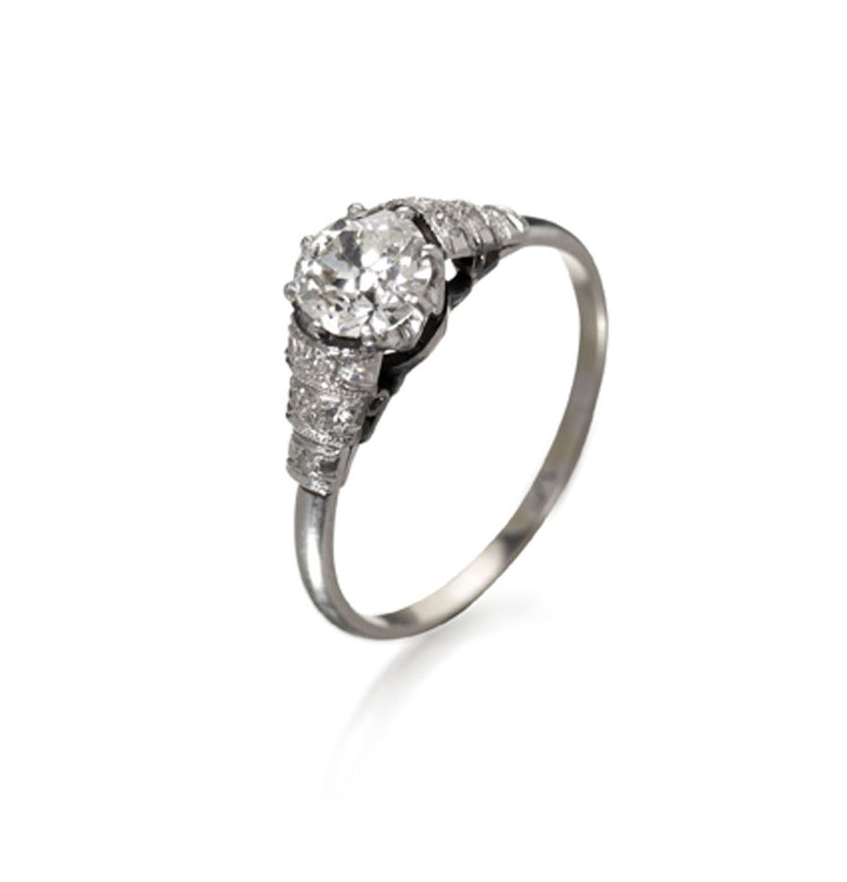 the central claw set early round brilliant cut diamond flanked by tapering stepped shoulders set with smaller single cut diamonds