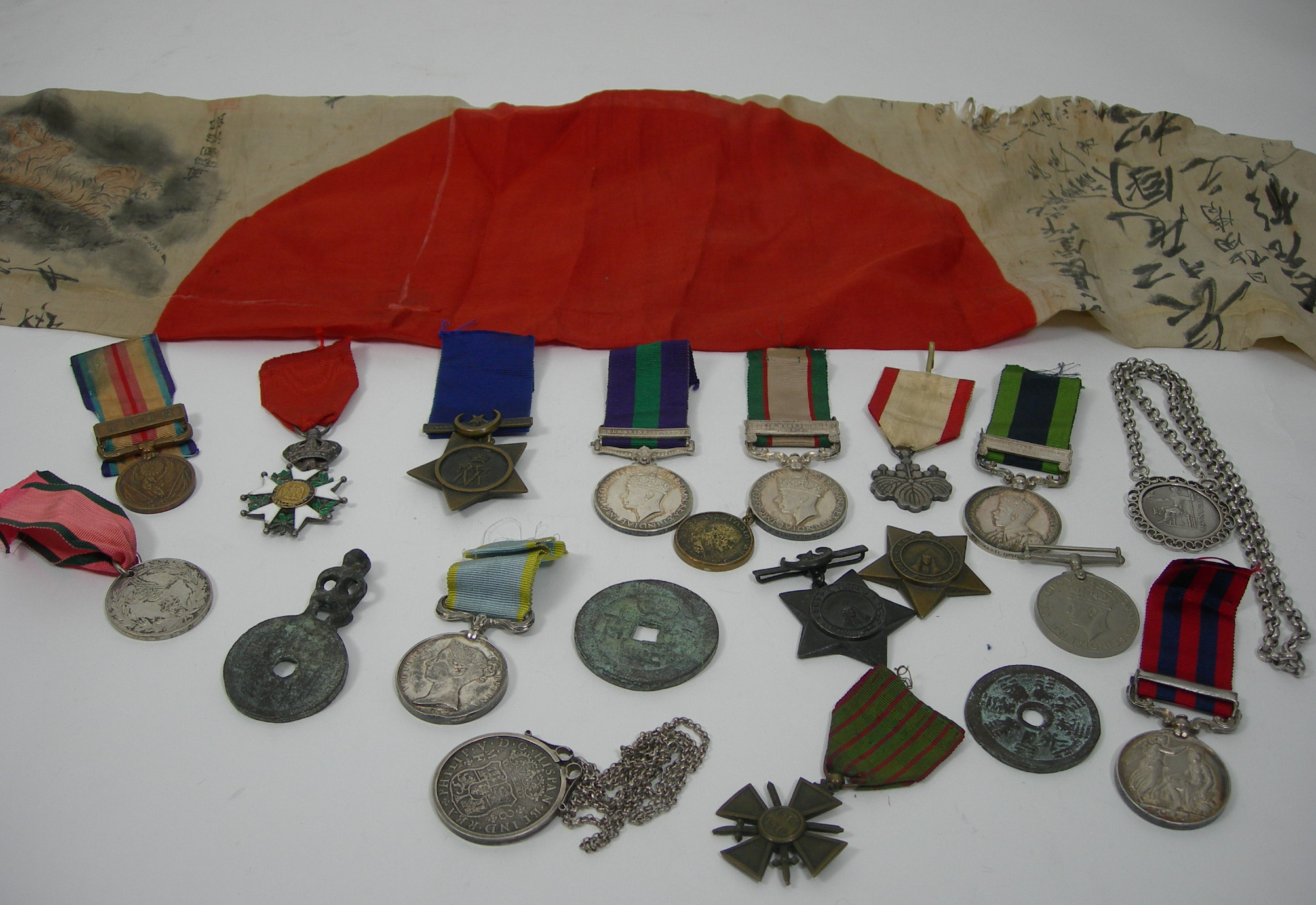 to include, a pair to Lt G J Hamilton 5-12 FFR, comprising India General Service medal (George V issue) North West Frontier 1935 bar; India General Service medal (George VI issue) North West Frontier 1936 - 37 bar; a Crimea medal (un-named) with Turkish Crimea medal (French issue); together with other general service medals; some foreign awards and a signed Japanese surrender flag (Qty)