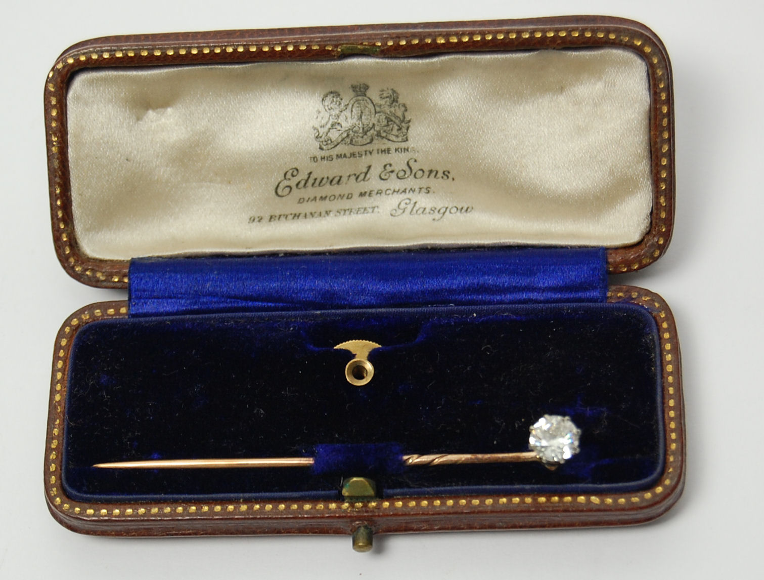 claw set with an old European cut diamond, with detachable screw turned fitting and alternative stud fitting, contained in a fitted case stamped EDWARD & SONS, GLASGOW