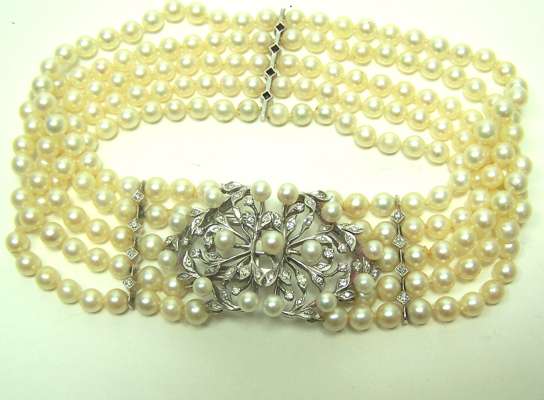 A Belle Epoque style cultured pearl and diamond bracelet,