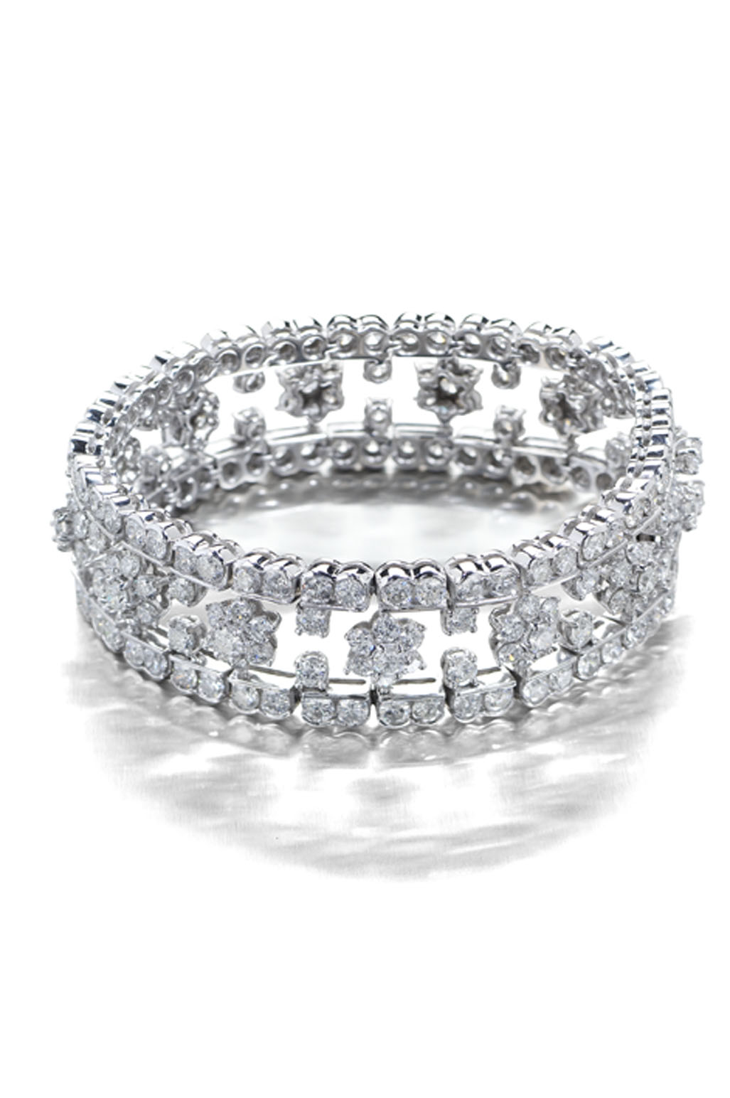 composed of floral clusters claw set with round brilliant cut diamonds, interspersed by pairs of similarly cut diamonds and flanked above and below by semi-collet set diamond borders, with concealed clasp