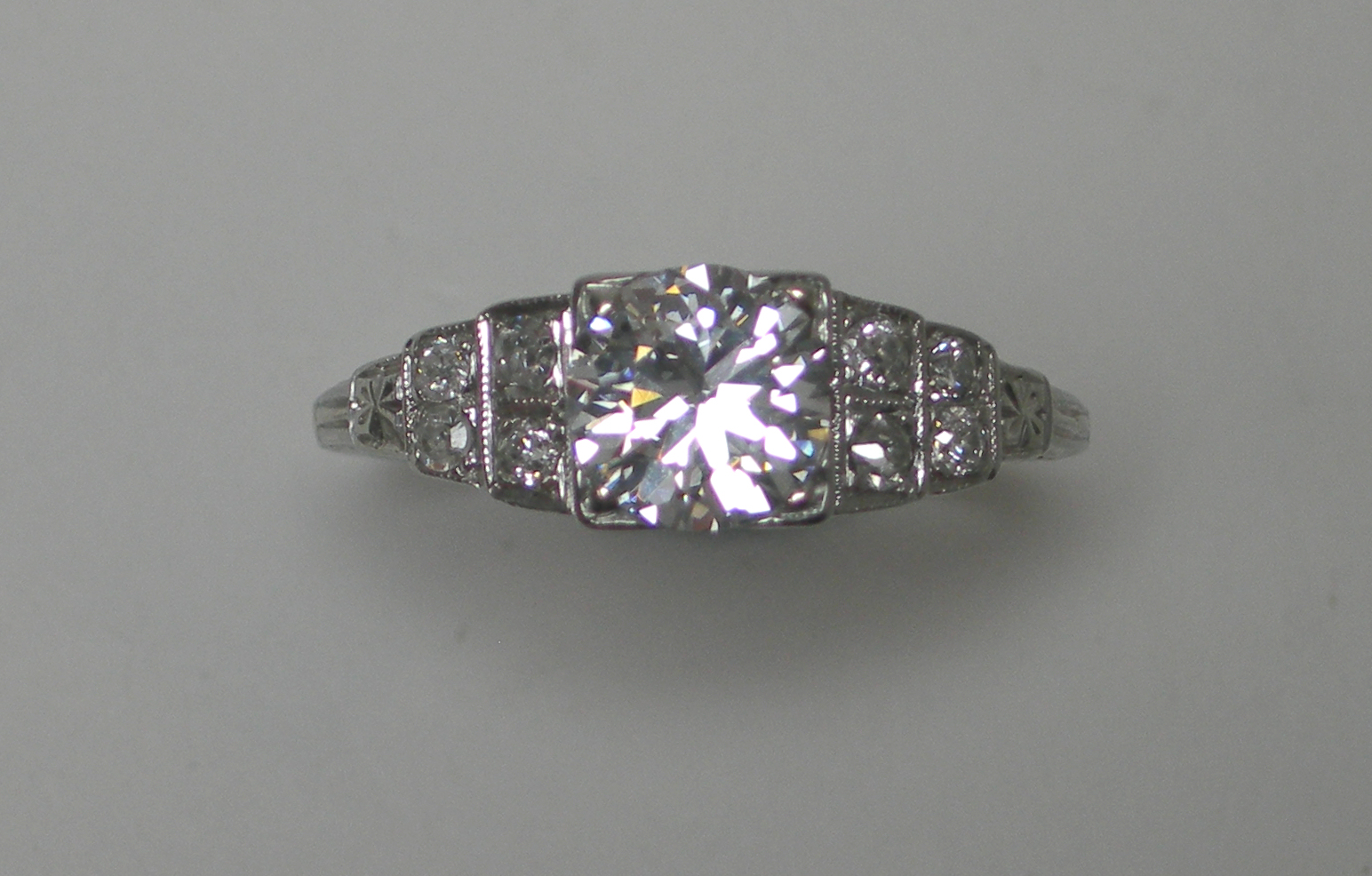 claw set with an early round brilliant cut diamond, flanked by stepped shoulders each set with four old European and single cut diamonds, mount stamped 18K