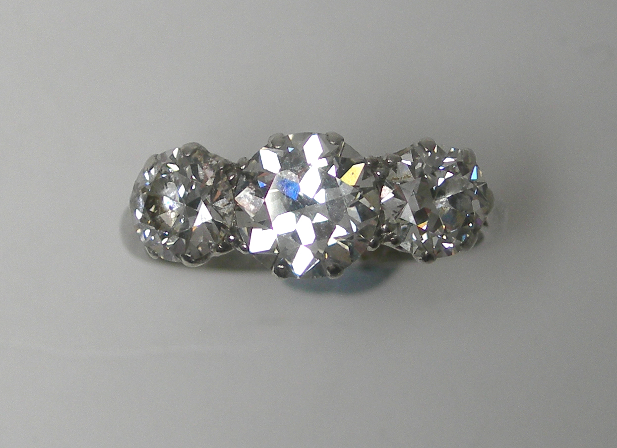 An early 20th century platinum mounted diamond three-stone ring,