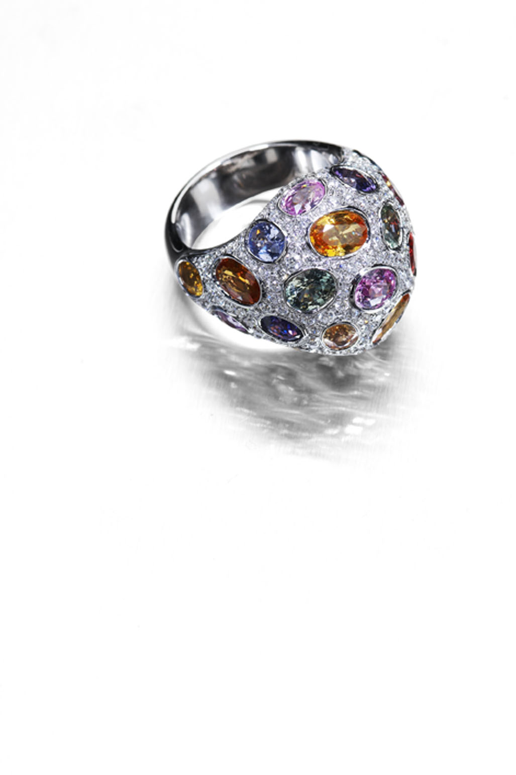 of bombe design, collet set with graduated oval cut assorted sapphires, also pave set with round brilliant cut diamonds, mount stamped 18K