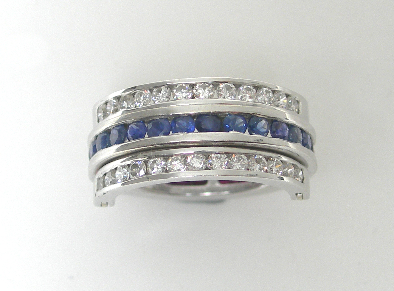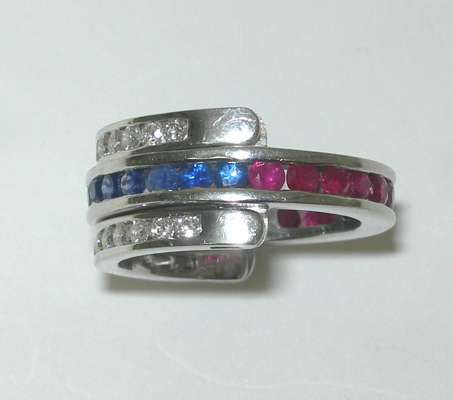 of swivelling design, the central band channel set to one side with circular cut rubies, with similarly cut sapphires opposite, the swivelling bands similarly set with round brilliant cut diamonds, mount stamped 750