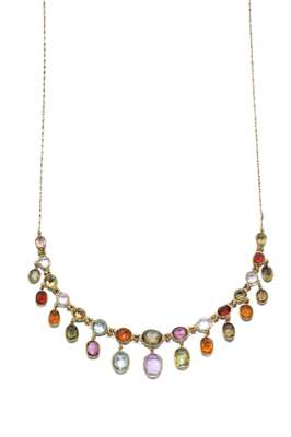 of fringed design, collet set to the front with graduated oval and circular cut assorted gem stones, suspended from a fine trace link chain