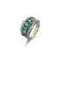 claw set with five graduated trap cut emeralds, flanked above and below by borders of graduated old European cut diamonds, to a split and foliate cast shank
