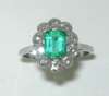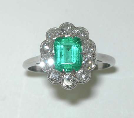 the central claw set trap cut emerald within a millegrain collet set surround of round brilliant cut diamonds